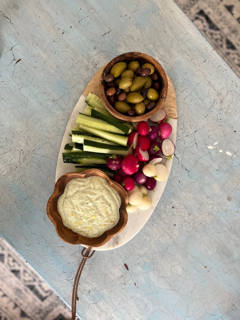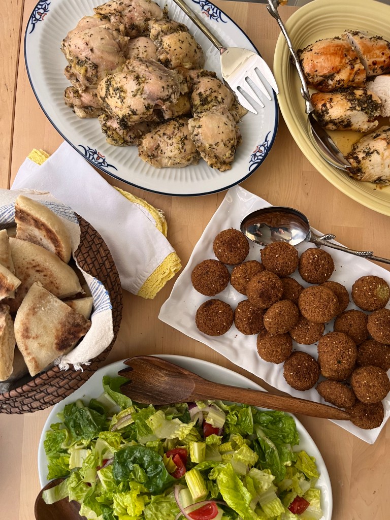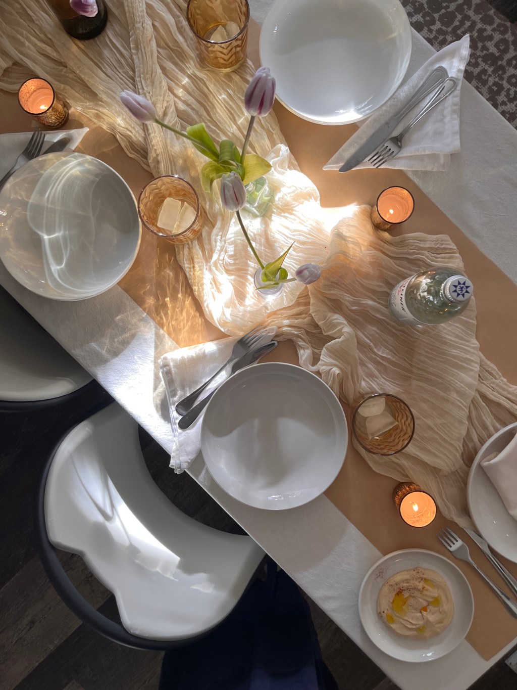 An amazing Middle Eastern chef in our neighborhood was making the most amazing hummus, tahini and the fluffiest, almost holy, pita for local pickup and I built the menu around that. A copycat salad dressing from my husband’s favorite restaurant, Greek inspired lemon chicken, falafel, Lebanese lemonade and an olive oil cake. I sent out invites to my loved ones and borrowed an extra table and chairs. I set the tables with remnants of wedding decor — gauzy table runners and little flickering tea lights. Tulips in recycled bottles and vases. My favorite thrifted platters and my husband ironed napkins (we use cloth napkins in our day-to-day but they are wrinkled and rarely see an iron).